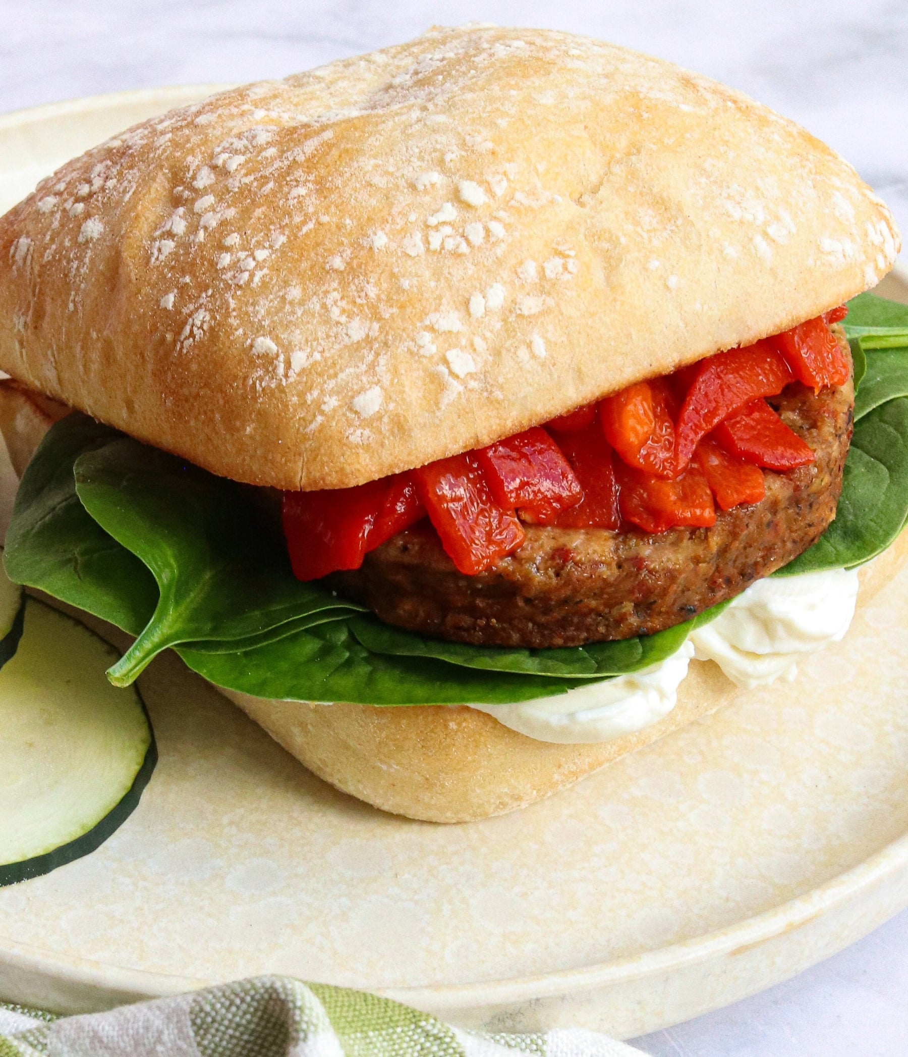 Coloca la burger sobre el pan, añade tiras de pimiento rojo asado y hojas frescas de espinaca baby.3 min