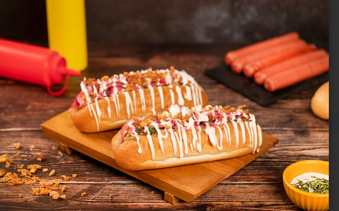 Coloca las salchichas dentro del pan, añade la cebolla morada y el pepinillo picado. Rocía con la mezcla de mayonesa y mostaza en forma de hilos.3 min -
